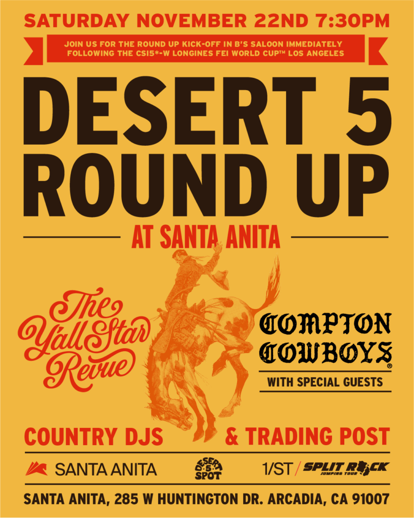Saturday features the Desert 5 Round Up After Party in B’s Saloon featuring live performances by the Compton Cowboys and special guests Country DJs & Trading Post, immediately following the CSI5*-W.